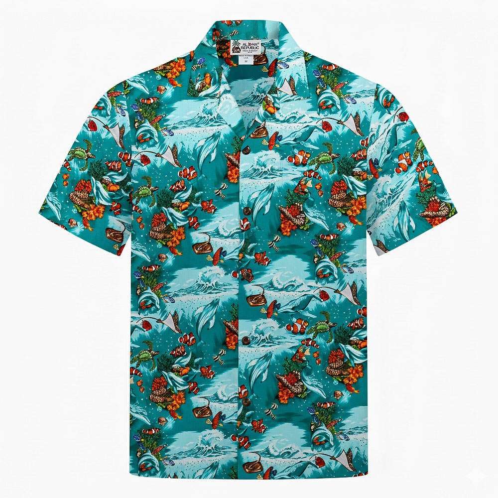 Hawaii, est également un lieu de passage pour les baleines, les dauphins, les tortues. Cette faune fait partie intégrante de la culture Maori. Tous ceux qui ont la chance d’écouter le chant des baleines en gardent un souvenir extraordinaire. Cette chemise s’adresse à ces chanceux et à tous ceux qui rêvent de les voir, les suivre et les écouter à leur tour.