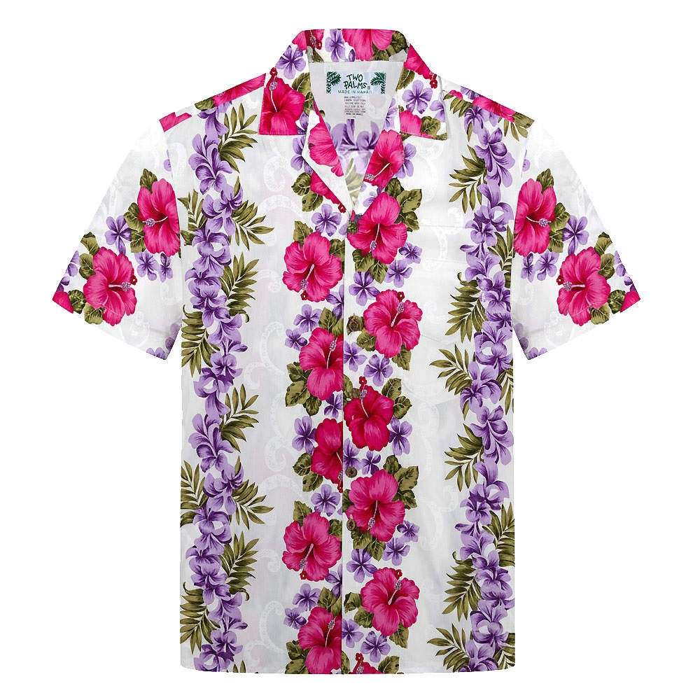 Cette chemise hawaii tropique nous vient des ateliers Two palms à Honolulu. son design constitué de fleurs tropicales, sur fond blanc s’inscrit véritablement dans l’esprit des iles.