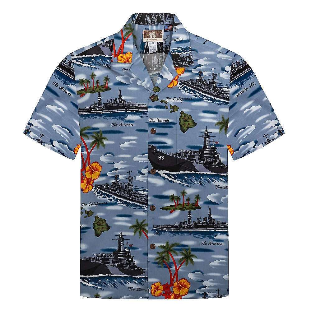 cette chemise représente les bateaux de l’US MARINE, le croiseur California, les cuirassés Missouri, New Jersey, Arizona, Nevada