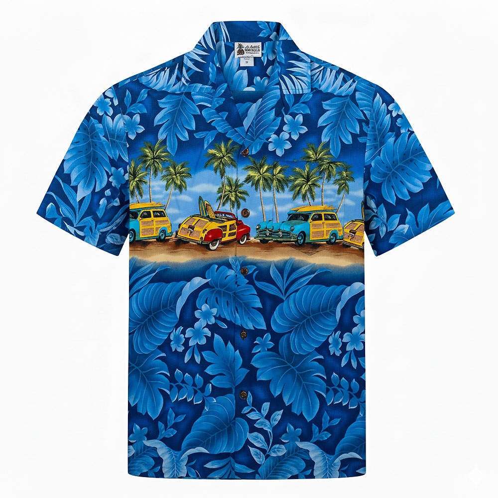 Cette chemise hawaiienne woodie blue nous vient des ateliers ALOHA REPUBIC à Honolulu. Avec son en bandeau, fait de voitures woodies, de planche de surf, de cocotiers sur un fond gris, de fleurs tropicales ton sur ton, elle sera appréciée par les surfers et les amateurs de woodies, de roadster également.