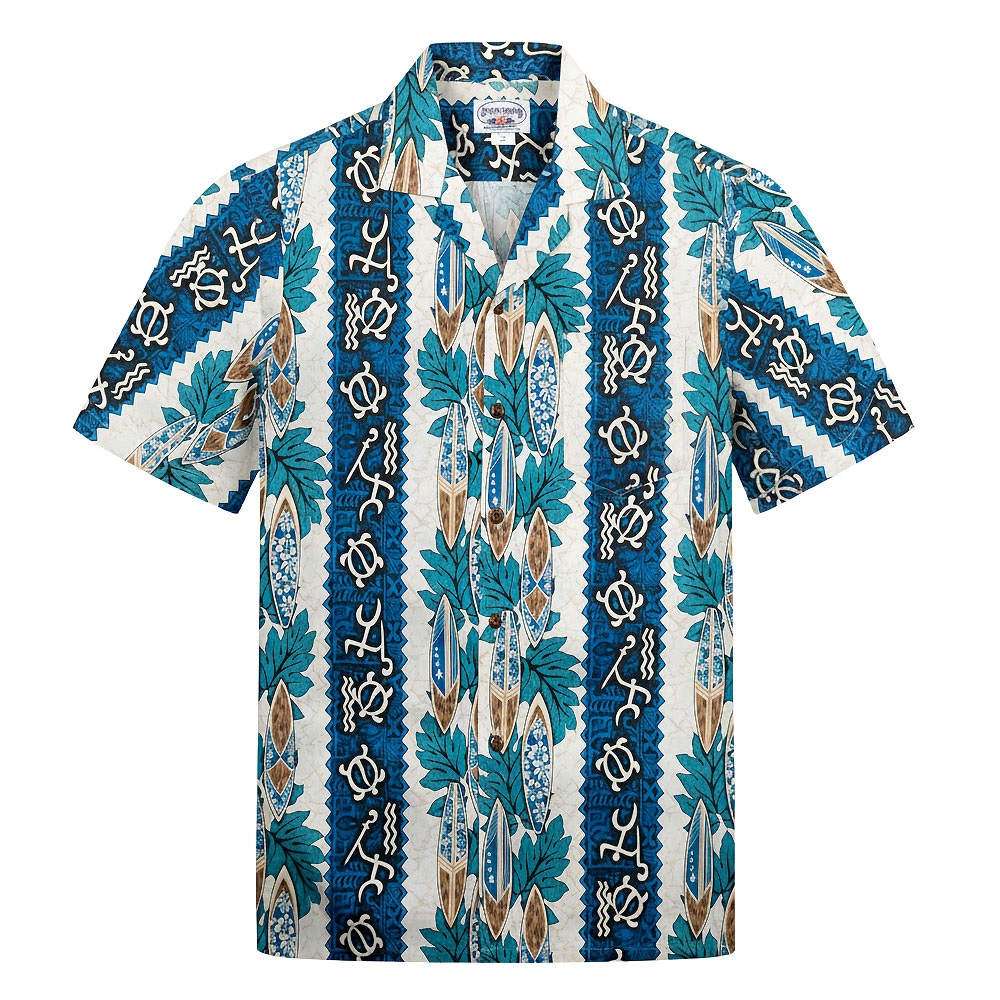 Cette chemise Hawaiienne TRIBAL nous vient des ateliers PACIFIC LEGEND à Honolulu, à quelques mètres de la plage de Waikiki. Construite en coton, elle est solide, durable et n’a pas besoin d’être repassée, grâce à ses motifs tribaux, elle ne peut être que polynésienne. Elle est également agrémentée de planches de surfs et de plantes tropicales. Son imprimé délicat crée un contraste harmonieux, idéal pour ceux qui souhaitent afficher un look sophistiqué sans renoncer à l’esprit des îles.