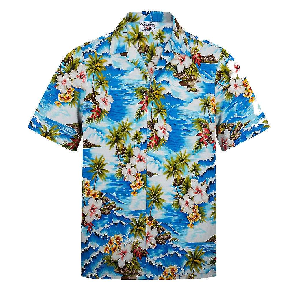 Cette Chemise Hawaiienne nous vient des ateliers PACIFIC LEGEND à Honolulu, à quelques mètres de la plage de Waikiki. Construite en coton, elle est solide, durable et n’a pas besoin d’être repassée. Cette chemise très tropicale et colorée, avec ses fleurs Hibiscus, palmiers et ses iles battues par les vagues, sera parfaite pour vos soirées estivales.
