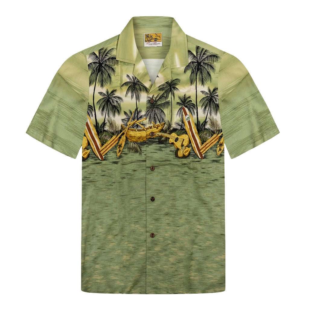 Cette chemise Hawaii est importée des ateliers Winnie Fashion à Honolulu. Avec son bandeau constitué de fleurs tropicales, de canoé, de pirogue, de palmiers, de ukulélé elle s’inscrit véritablement dans l’esprit des iles.